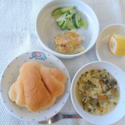 今日はハンバーガーです。 バンズパンにハンバーグをはさみセルフでハンバーガーを作ります。 ひじきが入っていて栄養満点です。 ブロッコリーとカリフラワーの花野菜はカレーソテーにしました。 バタ … 続きを読む