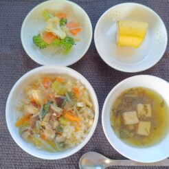 今日は秋の香りごはんです。 なたね油で鶏肉、にんじん、しめじを炒め、しょうゆ、みりんで味付けます。 さつま芋は素揚げにして、ごはんは昆布と塩を一緒に入れて炊き上げます。 最後にすべて合わせて … 続きを読む