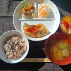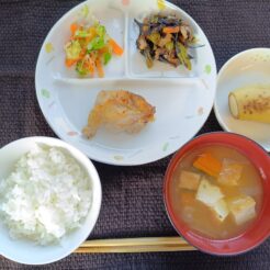 今日は鶏肉のみそ焼きです。 みそ、みりん、酒、おろしたしょうが、ごま油を合わせ、 鶏肉を漬け込んでオーブンで焼きました。 こんがり焦げ目がつき香ばしくておいしいです。 今日の給 … 続きを読む