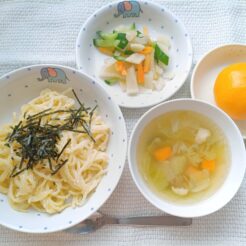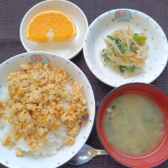 今日はあんかけチャーハンです。 ごはんと一緒に醤油を炊き込み香りを付けます。 そして炒り卵も合わせたごはんに野菜たっぷりのとろとろのあんをかけて食べます。 今日の給食(乳児量) … 続きを読む