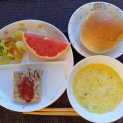 今日はハンバーガーです。 バンズパンにハンバーグをはさみセルフでハンバーガーを作ります。 ひじきが入っていて栄養満点です。 ブロッコリーとカリフラワーの花野菜はカレーソテーにしました。 バタ … 続きを読む