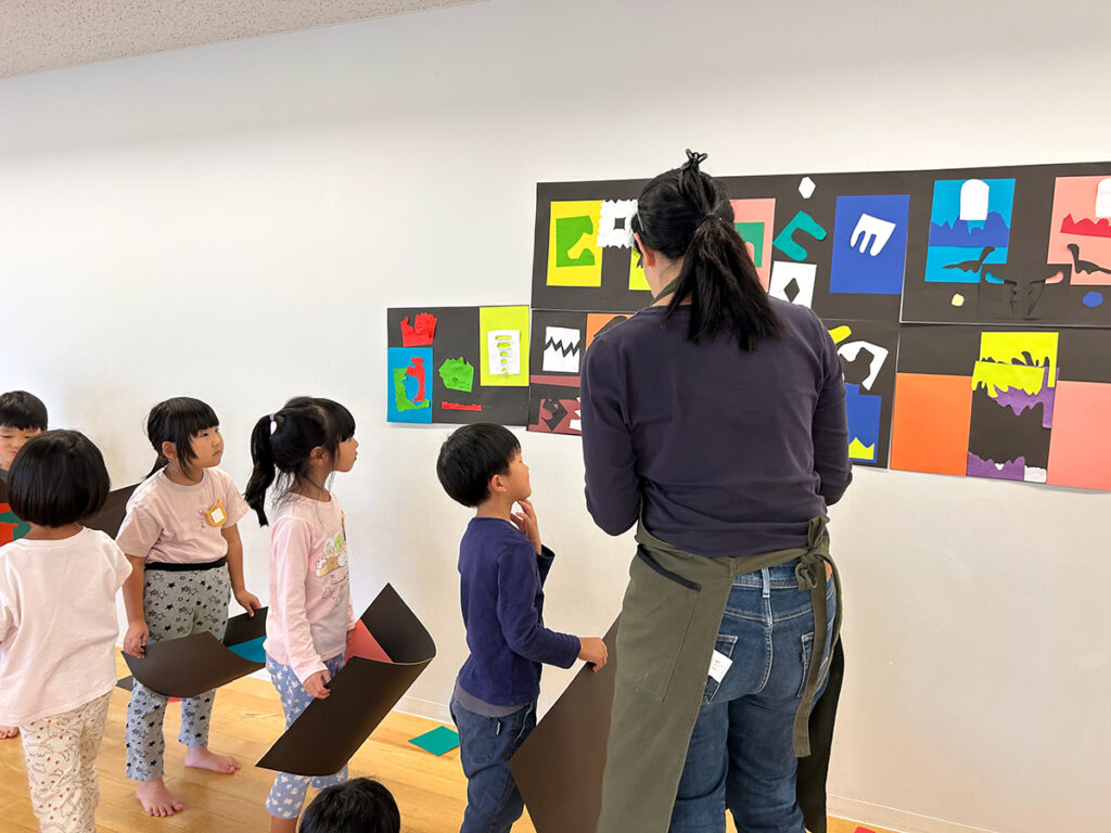 「送迎時に足を止めて見て行かれる方がとても多かったです」と教えてくれた担当の主任保育士からその様子をさらに伺ったところ、自分の作品を一生懸命指さして教える子や、松澤先生のワークショップのまとめに貼られていた写真の人物のことを聞かれて「マティスだよ!」と保護者に教える子もいたそうです。