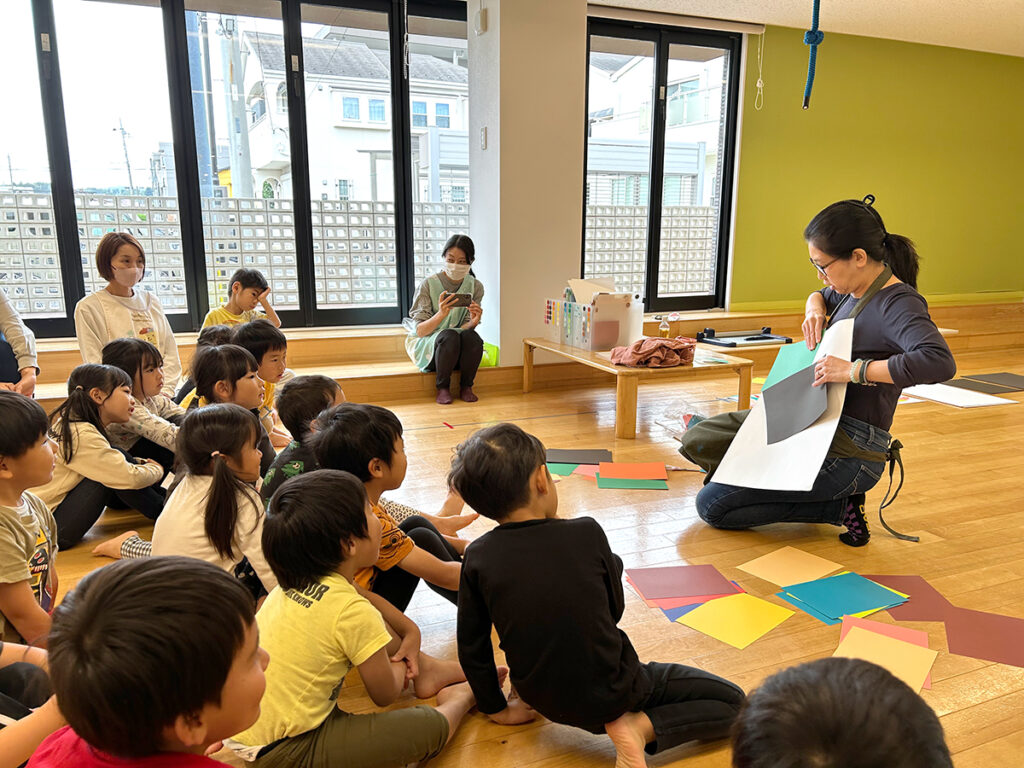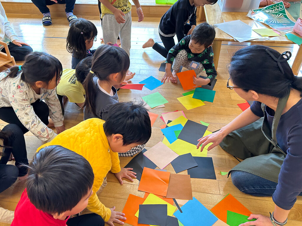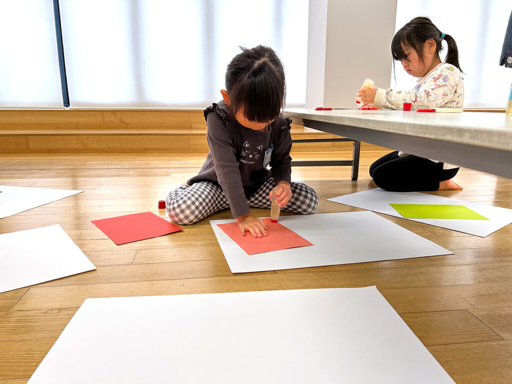年中クラスの子どもたちは白色ベースの台紙に、年長クラスは黒色ベースの台紙に、それぞれ自分の好きな色紙(台紙の1/2程度の大きさ)を2枚選んで貼り付け、次に別の色紙を思いついたままハサミで自由なカタチに切り取り、ベースの台紙に貼っていきます。