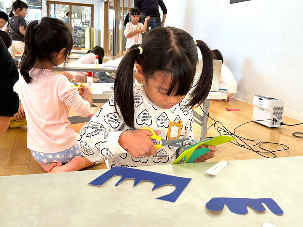 はじめる前は、先生たちと果たして子どもたちは自分の力でどこまでできるのか不安でした。自由気ままに切ればいい、と一言でいうのは簡単です。でも、大人でさえそう言われてサクサクと切り込みを入れられるだろうかと考えれば、先にいろいろなカタチを切っておいて、それを選んで貼るという方法さえ挙げたくらいです。