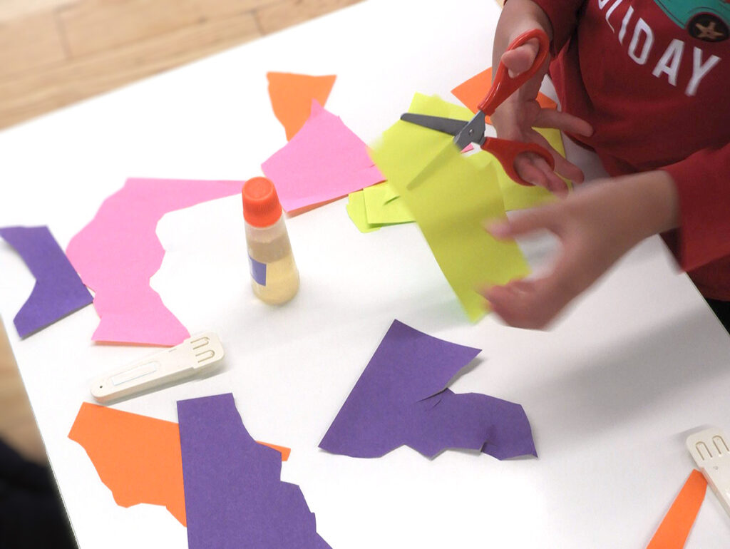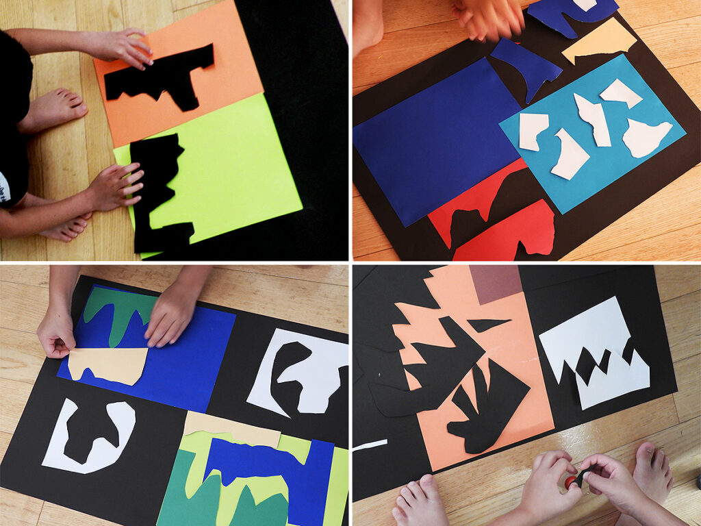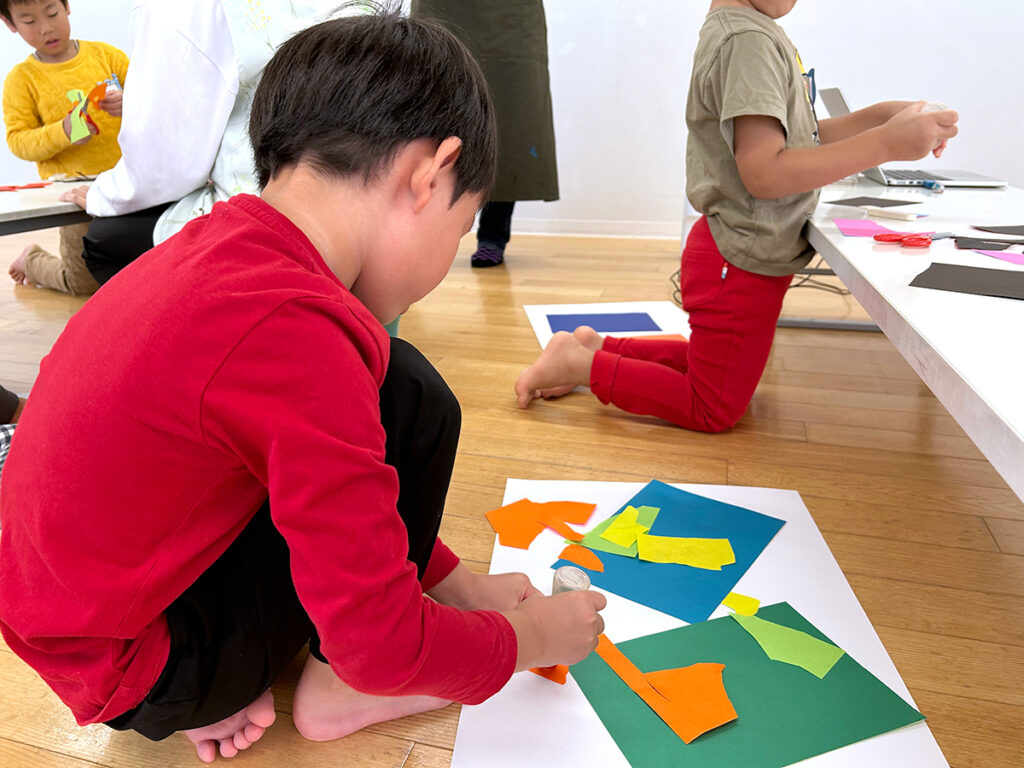 マティスの作品を大笑いしていた子どもたちも一転、真剣な表情で用紙の色を選び、大きな白や黒ベースの台紙に何度も迷いながら位置を決めて貼り付け、別の用紙を手に取りハサミをにぎると、時にすばやく大胆に、時にその動きを止めては慎重に、指先とハサミの動きをゆっくり、しっかり見つめて切り込んでいきました。