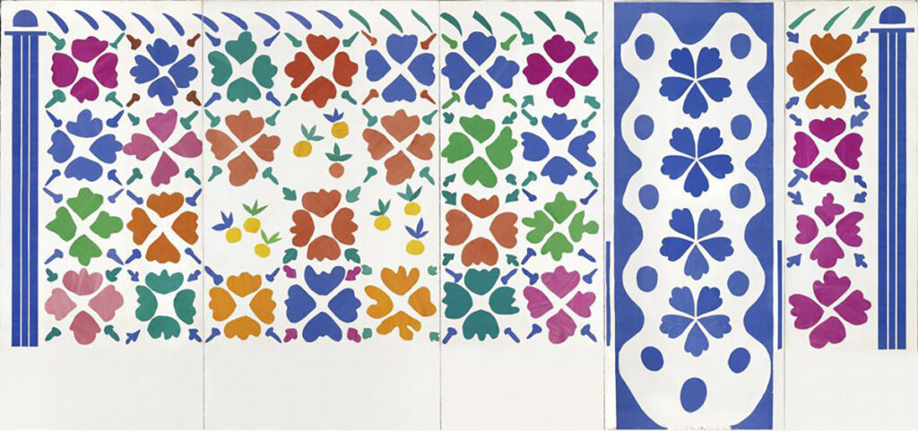 マティスは晩年大病をした後、体力が衰えたこともあり、助手が彩色した紙を切り抜いて貼り合わせる切り絵の作品づくりに没頭します。まさに筆をハサミに持ち替えたのです。しかし、これまで神経質なほどデッサンに拘り、緻密に練られた構図や色彩でカンヴァスに描いてきたマティスが、そうした前段階の周到な準備もなく作品づくりに入っていくことが不思議でしたが、考えてみたらそれらの準備をいきなり飛ばして作品を仕上げるというのは、こうした原点回帰のような境地にたどり着いた結果なのかもしれません。