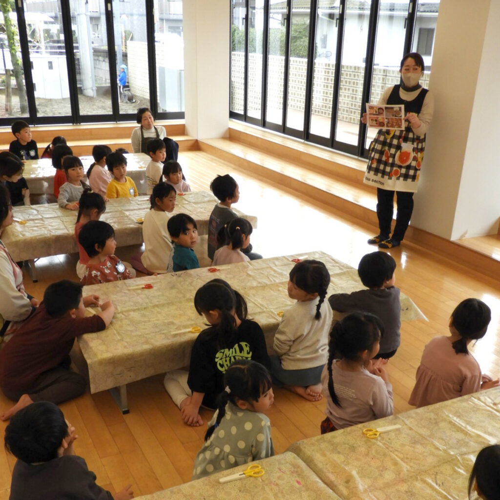 そしてそれぞれの机には、年中・年長クラスの子どもたちが交互に座ります。その周囲に、各クラスの保育士たちが同じく座ります。
