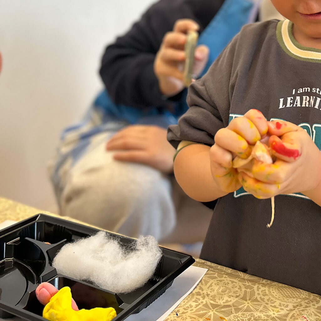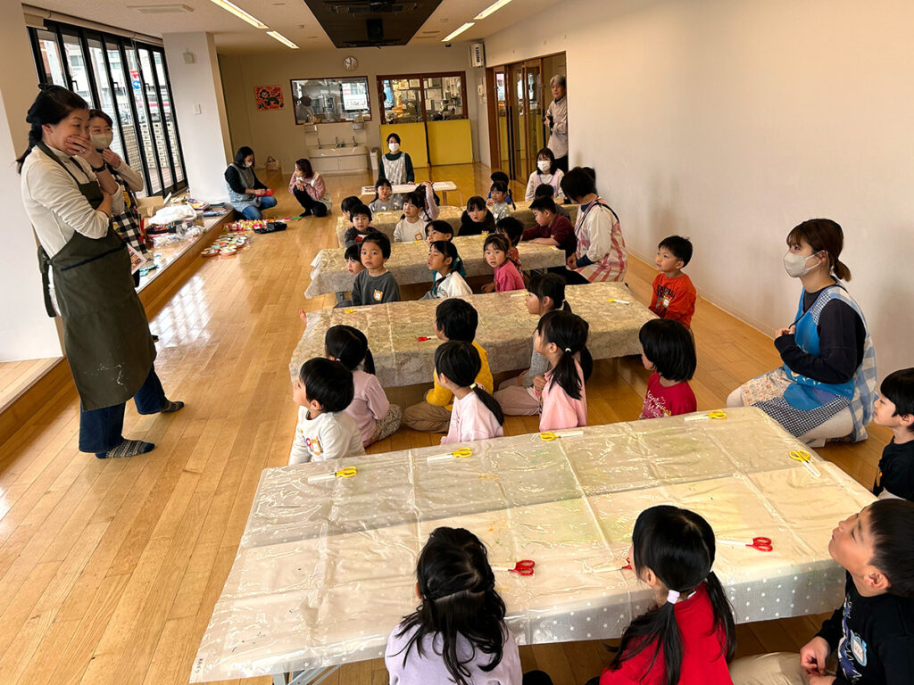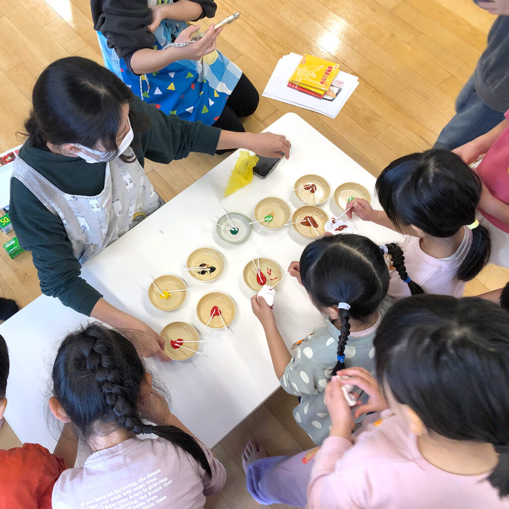それは年中・年長クラス合同でワークショップに臨むということです。通常それぞれが各1時間で入れ替わるところを、両クラスが通しで約2時間同じ作業を一緒に行うのです。