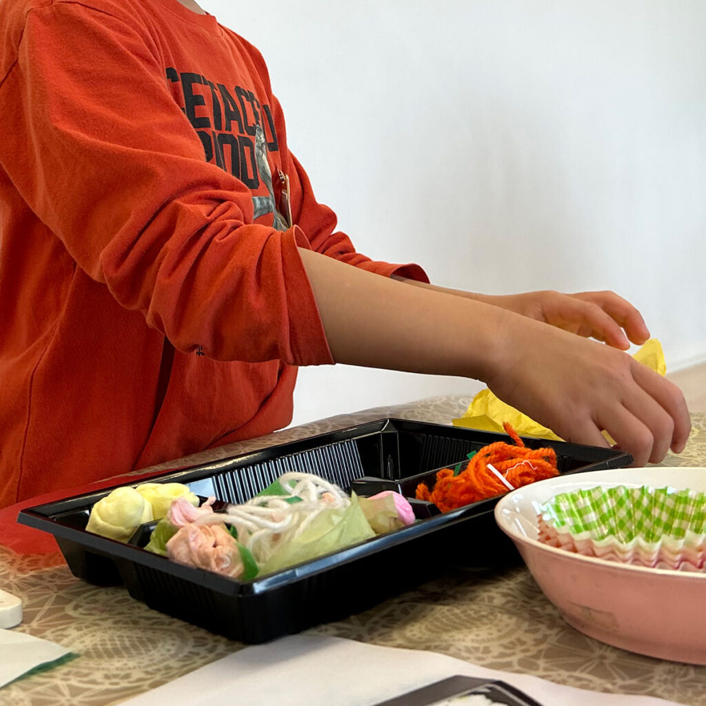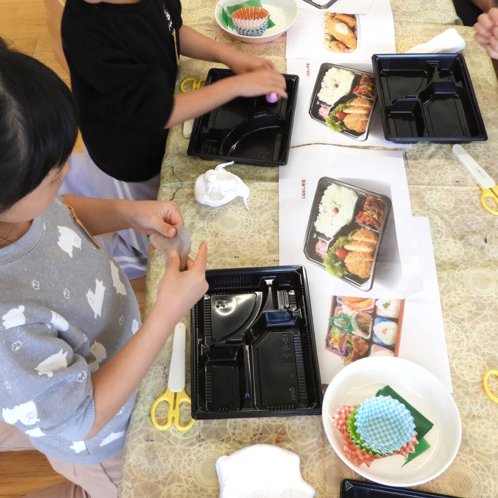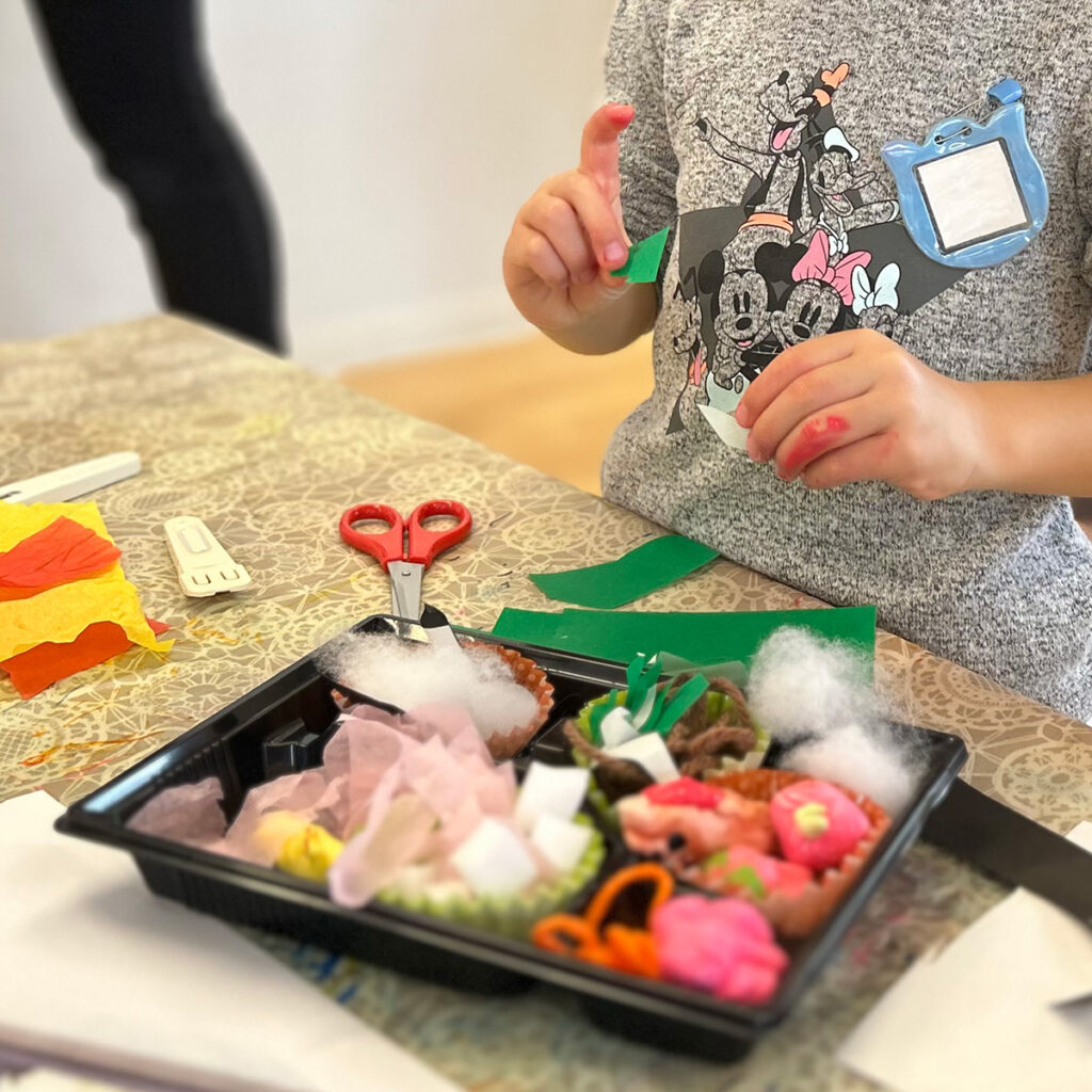 〝つくる〟と言っても、もちろん本物の食材を使うわけではありません。お弁当に詰める食材は、色彩を施した紙粘土や切り貼りが容易な色紙などワークショップではおなじみの工作用素材です。