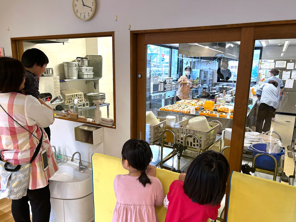当園のキッチンは、大きな窓ガラス越しに厨房の様子が覗ける、明るく開放的なスペースになっています。ちょうどワークショップを行っているホールの隣室がキッチンなので、ホールからは厨房の様子が手に取るように見えるのです。