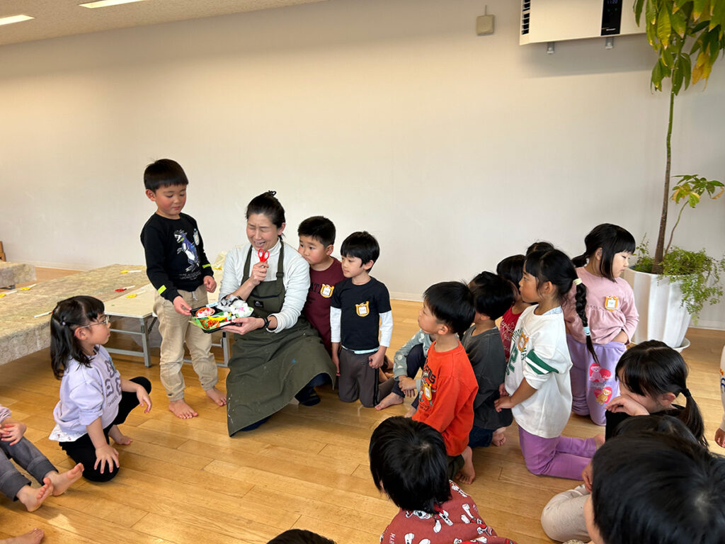 子どもたちひとり一人の前には、空のお弁当の容器(いくつかの層に区切られた業務用の簡易なもの)が置かれています。子どもたちは「あ、お弁当の入れ物だ」と口々に発しては手にとるなどして少し落ち着かない様子。