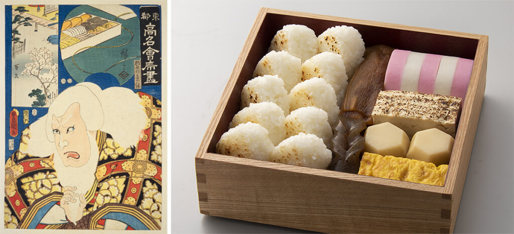 その後、形態は変えつつも、現在の原型に近いお弁当が登場するのは江戸時代だそうです。特に今回テーマに採り上げた〈幕の内弁当〉は、歌舞伎など庶民の芸能が発達した時期のものです。まさに〝幕〟の〝間(内)〟のお楽しみだったのでしょう。