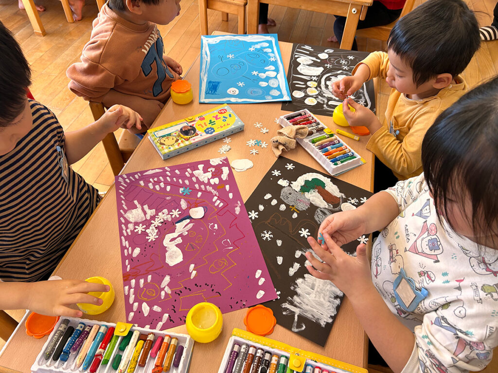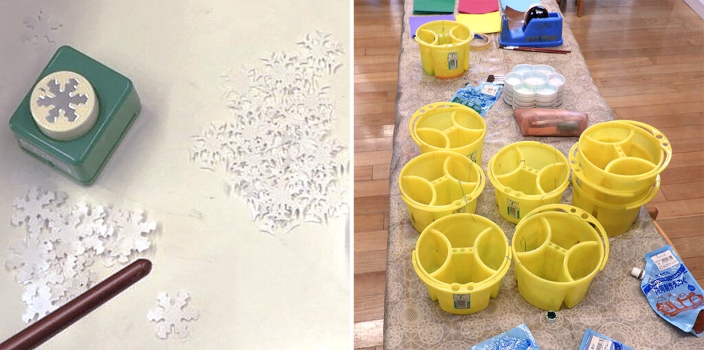 画材は絵の具やクレヨンを使います。それからリアルな雪の感じを出したい子には、スタンプで作成した〈雪の結晶(型)〉を配りました。