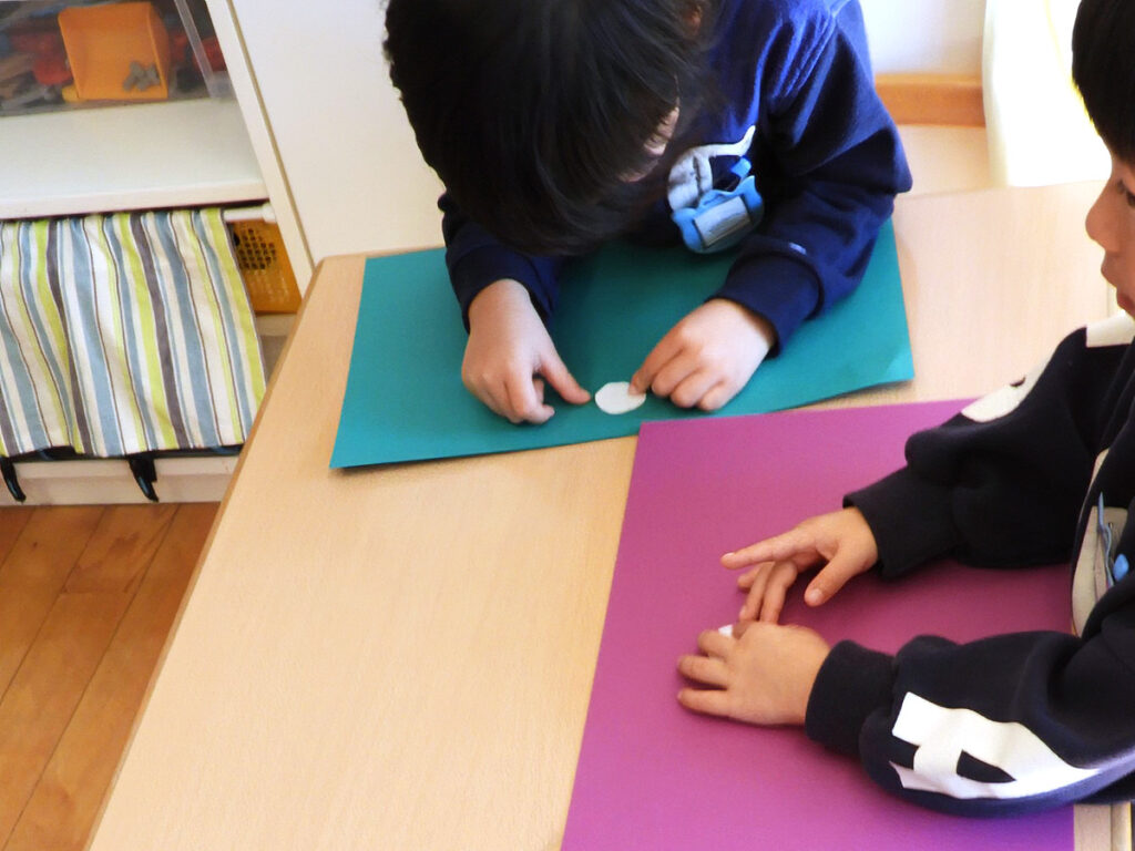 それから先生は1枚の色画用紙を手にして、いま降り落とした白い円形の紙を1枚つまむとその色画用紙の中心に置いてみました。背景の色のなかに、ポツンと1枚の小さな白色はきれいでよく目立ちます。