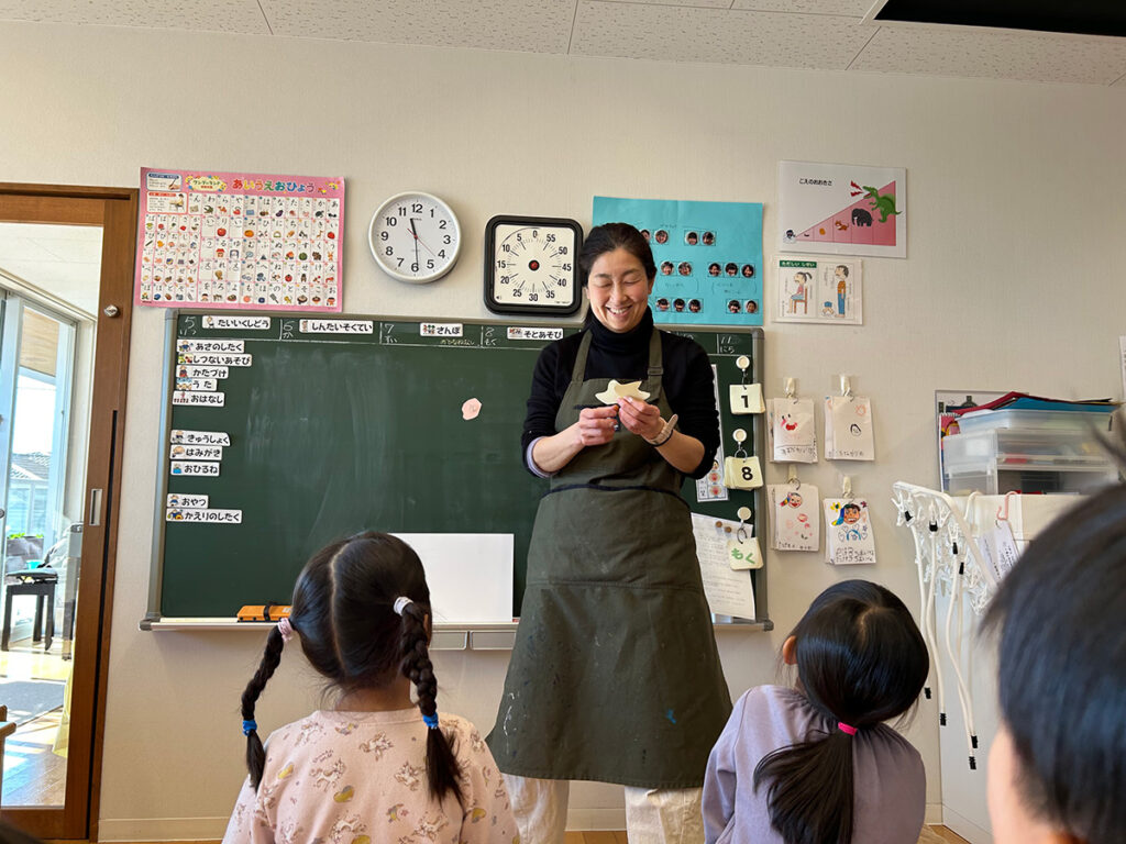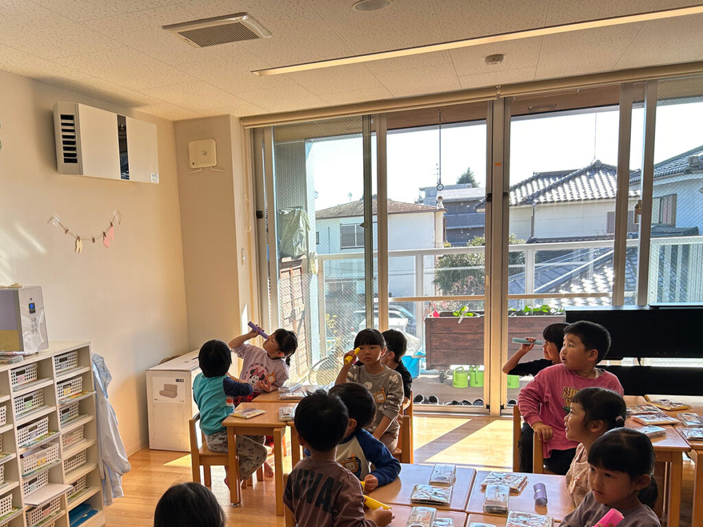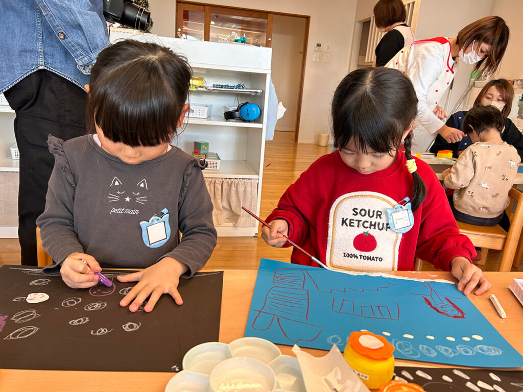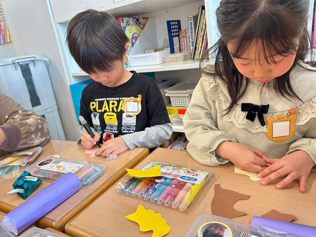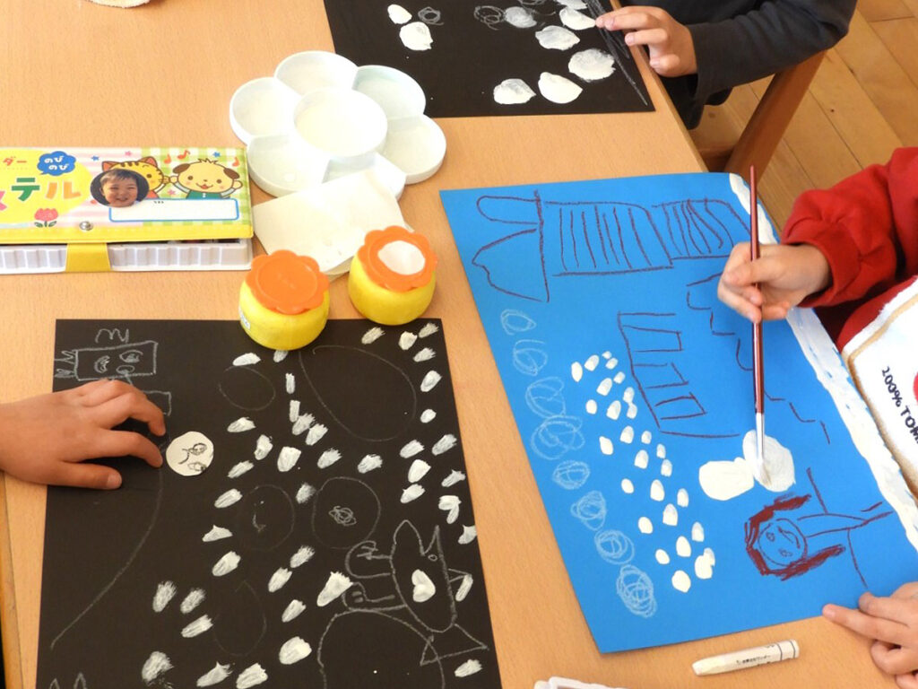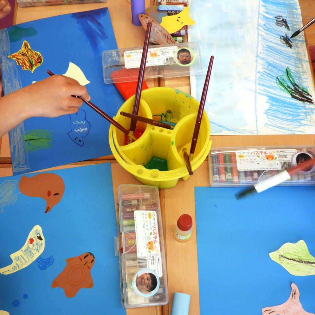 今回のワークショップは、年中・年長クラスそれぞれの部屋で行いました。子どもたちにとっては勝手知ったる空間ですから、いつものワークショップとは違う発想や作品が生まれるかもしれませんね。