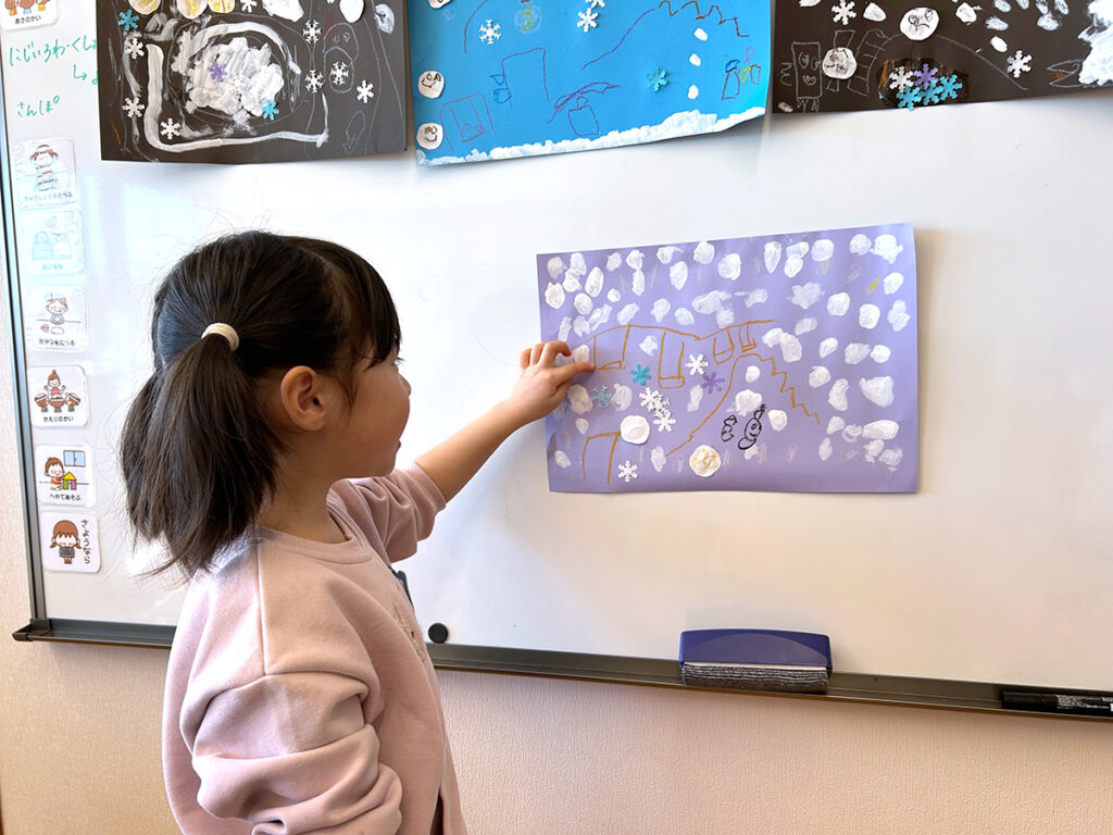 先生がそう話す通り、〈雪〉を模した形の紙を手掛かりに子どもたちの想像力は膨らみ、誰もが自分の頭のなかだけでつくり上げた想像上の「雪のある景色」を完成することができました。