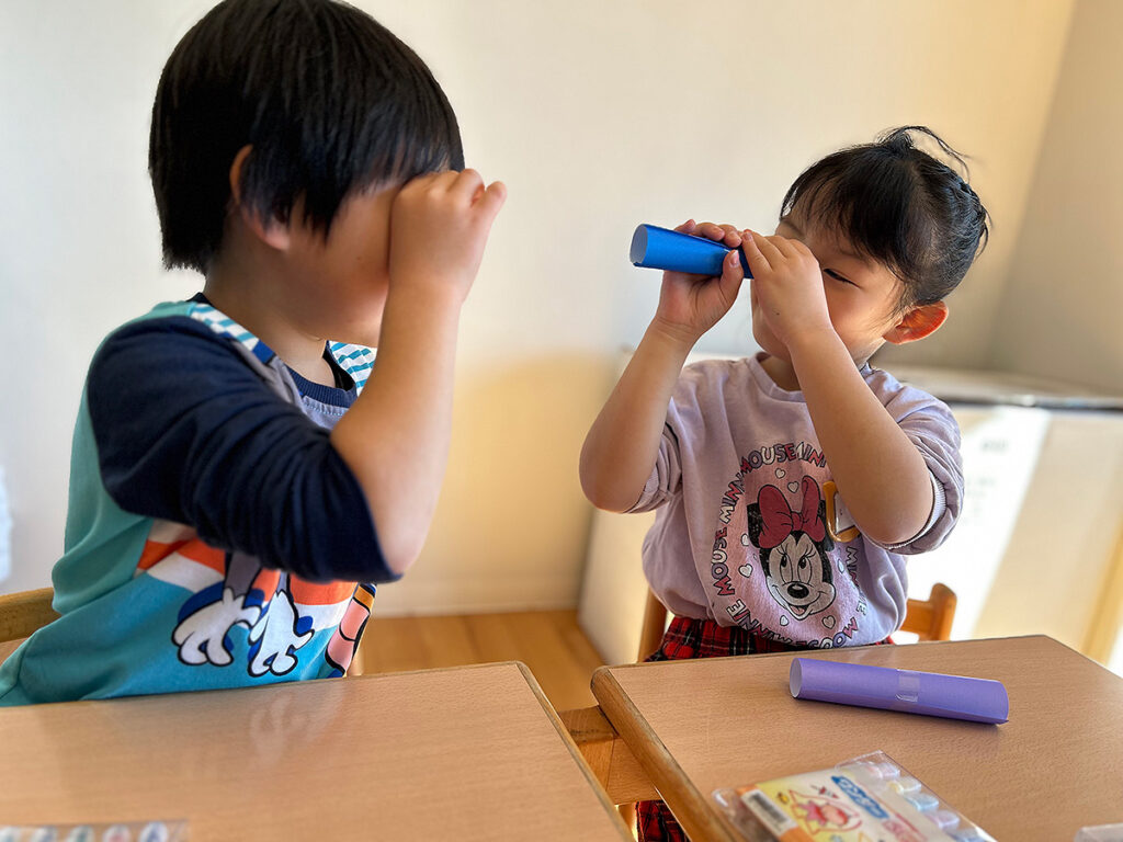 子どもたちは好きな色の色紙を選び、早速手づくりの望遠鏡で周囲を覗きはじめました。
