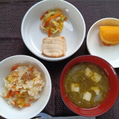 今日は秋の香りごはんです。 なたね油で鶏肉、にんじん、しめじを炒め、しょうゆ、みりんで味付けます。 さつま芋は素揚げにして、ごはんは昆布と塩を一緒に入れて炊き上げます。 最後にすべて合わせて … 続きを読む
