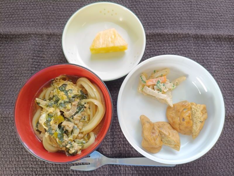 今日の給食は肉たまあんかけうどんです。