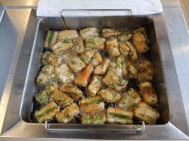 竹輪の磯辺揚げは大人気のメニューで、小麦粉とあおのりで作った衣に付けて揚げます🔥