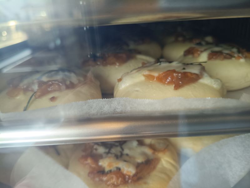 ベーコン、玉ねぎを炒めててりやき味に作り、ナン生地にのせチーズをかけてこんがり焼き目つけます。