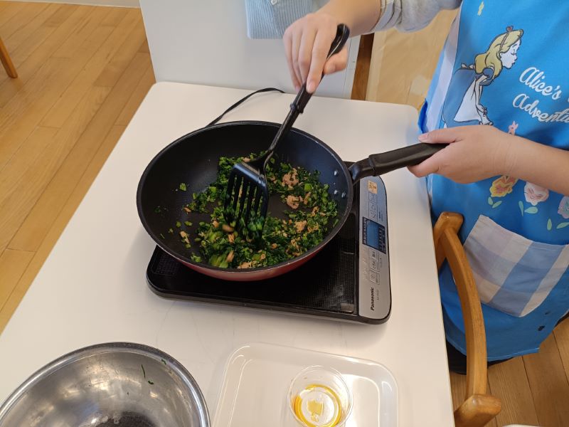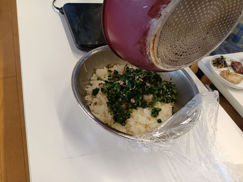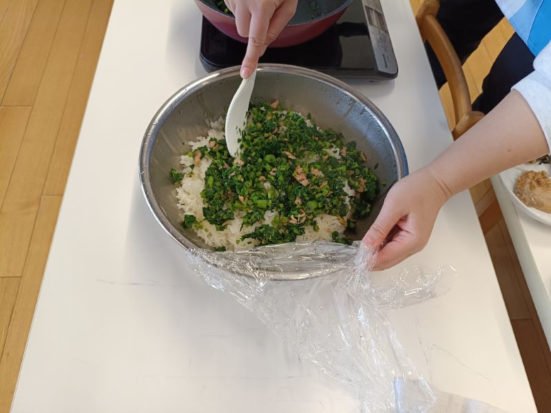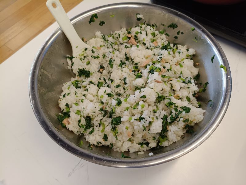 ごはんに混ぜたら、おいしそうな小松菜ごはんの出来上がりです✨