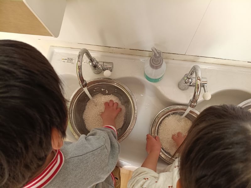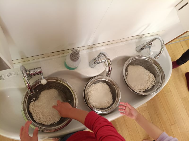 昨日はな組さん、つき組さんが代表でもち米をといでくれました。