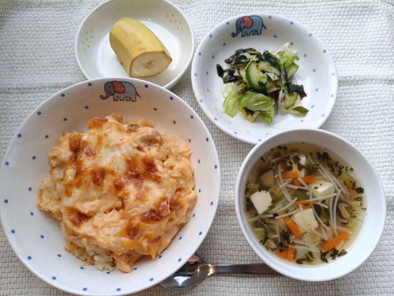オーロラドリア 2026年2月16日 月曜日給食ブログ 今日は大人気のオーロラドリアです。 無塩バター、小麦粉、牛乳で作った真っ白のルウに ケチャップを入れるときれいなピンク色になります。 鶏肉、玉ねぎ、にんじん、ピーマンのピラフにかけて、 チーズをたっぷりのせこんがり焼いて出来上がりです。 今日の給食(幼児量) ★ オーロラドリア ★ ★ 海藻サラダ ★ ★ ビーフンスープ ★ ★ バナナ ★ 今日のおやつ ★ クロワッサン ★ ★ 牛乳(幼・乳) ★