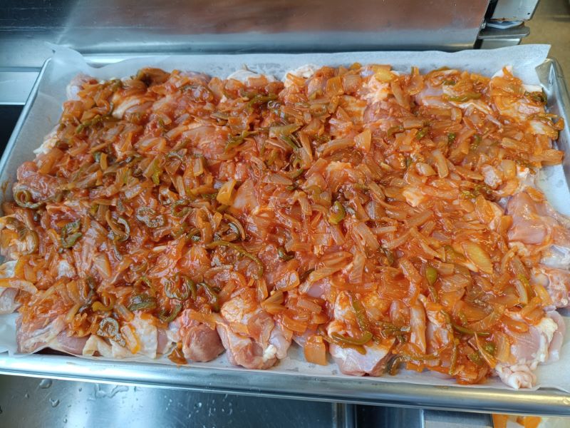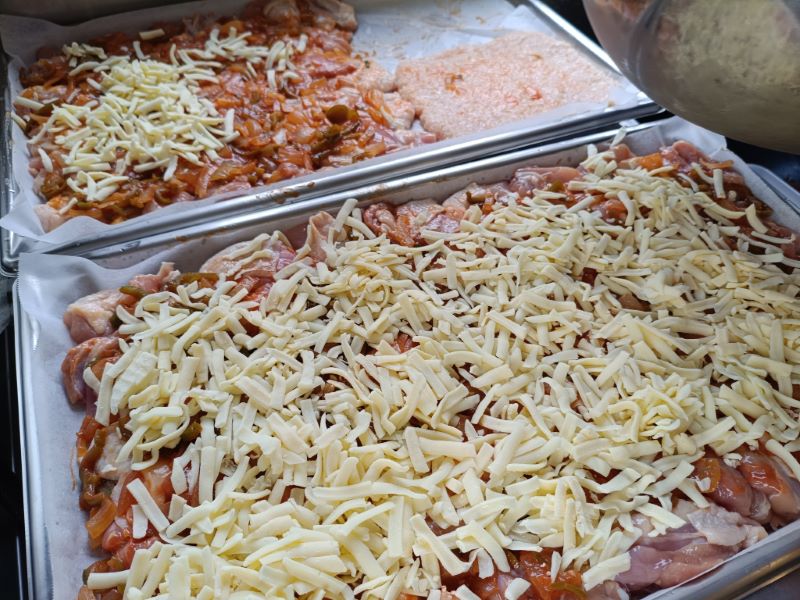 下味を付けた鶏肉の上にピザの具を乗せてチーズを乗せてこんがり焼きます💡