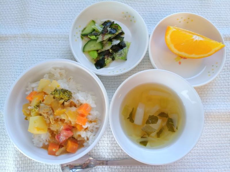 カレーライス🍛 2026年3月9日 月曜日給食ブログ 今日の給食はカレーライスです🍛 今日のカレーには豚肉を使いました🐷 野菜は人参、玉ねぎ、ジャガイモ、、、と定番の物を使いますが、保育園のカレーにはブロッコリーも入ります!!🥦 他にはカットトマトや、スキムミルク、仕上げにピザチーズなど、実は色んな物が入っているんですよ🌟 今日の給食 ★ カレーライス(麦飯) ★ ★ 海藻サラダ ★ ★ かぶとえのきのスープ ★ ★ オレンジ ★ 今日のおやつ ★ クロワッサン ★ ★ 牛乳(幼・乳) ★