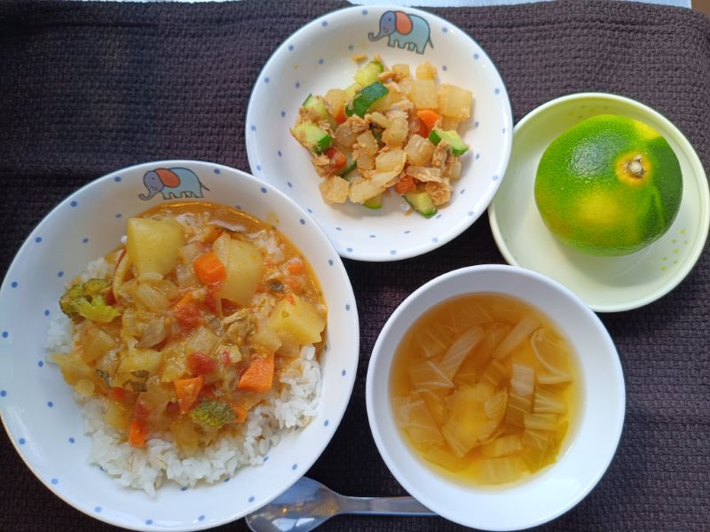 玉ねぎ、にんじんを炒めじゃが芋を入れて煮て、具材がやわらかくなったら、ダイストマト、すりおろしりんごを加え、