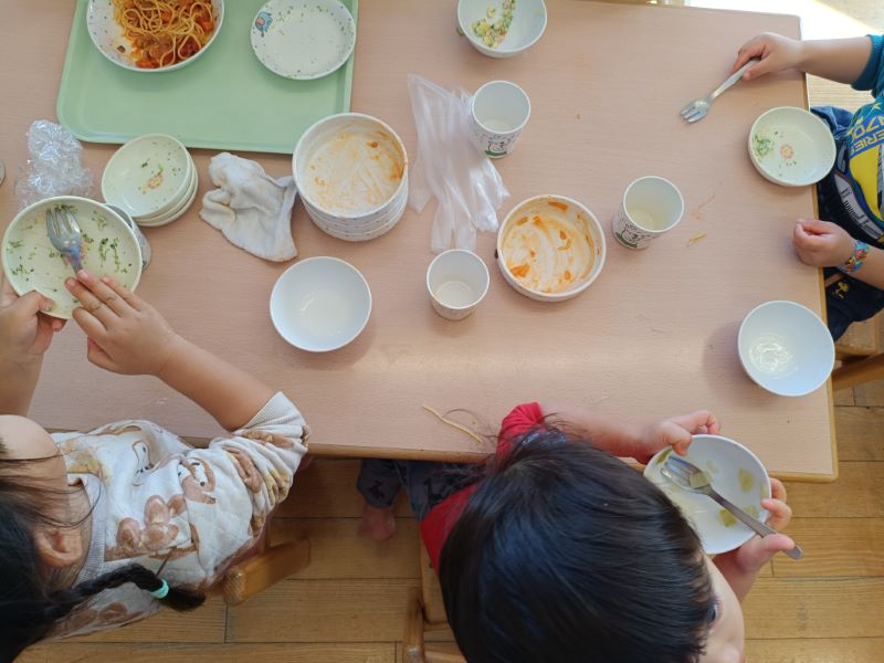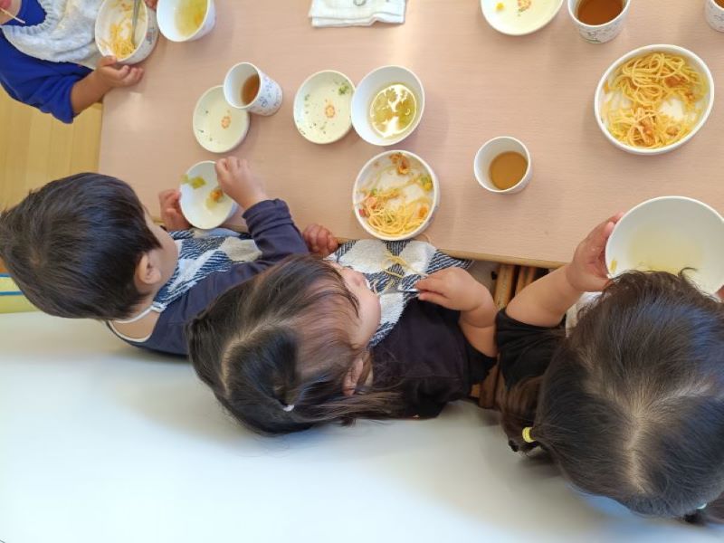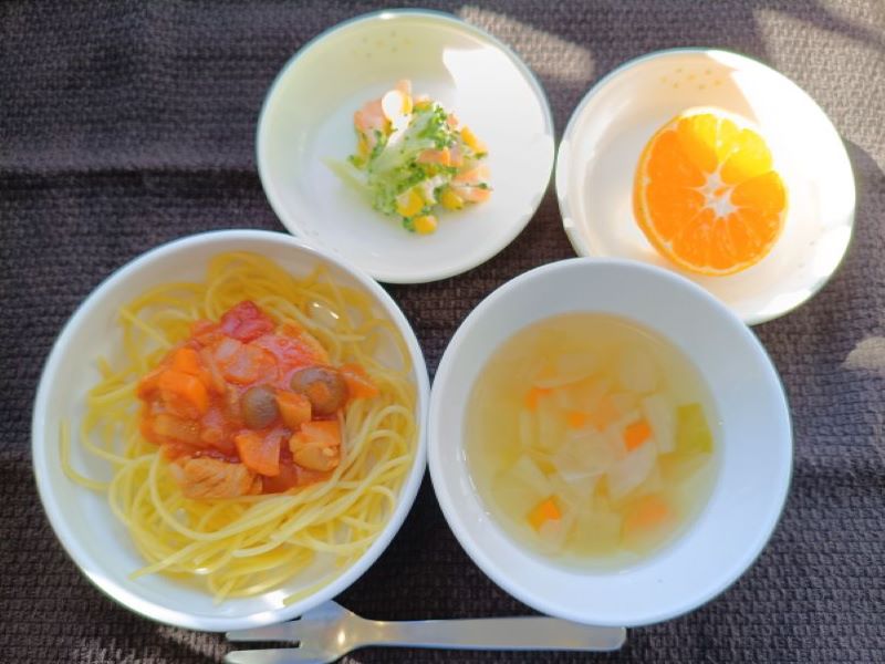 チキンのトマトパスタ 2025年12月26日 金曜日給食ブログ 今日はチキントマトパスタです。 鶏肉、玉ねぎ、にんじんを炒め、たっぷりのダイストマトとトマトピューレで煮ていきます。 しめじも加えてさらにコトコト煮て、甘味を出します。 トマトの濃厚な味つけを楽しめるパスタです。 今日の給食(乳児量) ★ チキンのトマトパスタ ★ ★ コーンサラダ(マヨブロッコリー) ★ ★ コロコロ野菜スープ ★ ★ みかん ★ 今日のおやつ ★ わかめおにぎり ★ ★ 牛乳(幼・乳) ★ 🍅ぺんぎん組(1歳児クラス)🍅