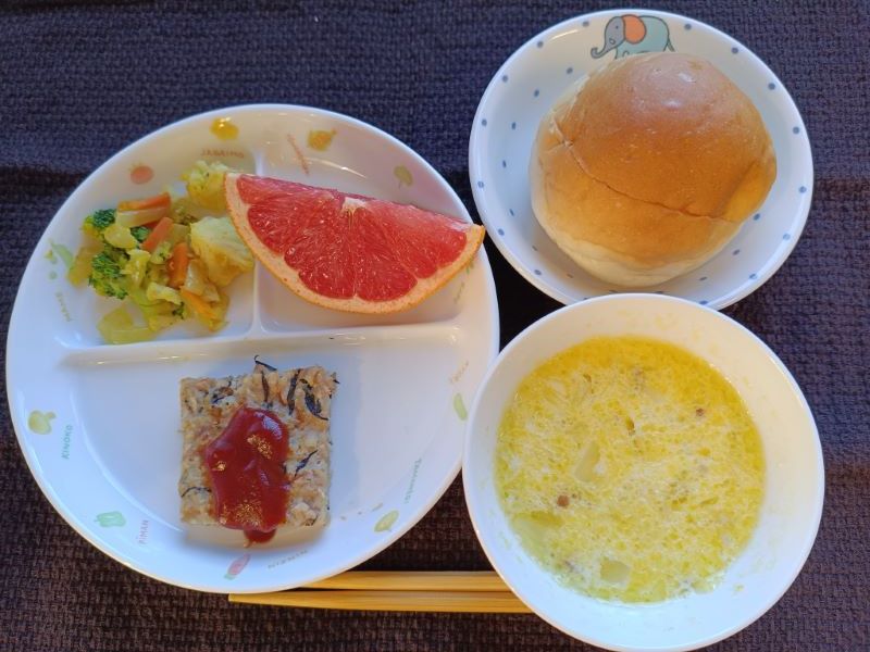 ハンバーガー🍔 2025年12月4日 木曜日給食ブログ 今日はハンバーガーです。 バンズパンにハンバーグをはさみセルフでハンバーガーを作ります。 ひじきが入っていて栄養満点です。 ブロッコリーとカリフラワーの花野菜はカレーソテーにしました。 バターを使用し風味良くしあげました。 今日の給食(幼児量) ★ バンズパン ★ ★ ハンバーグ ★ ★ 花野菜のカレーソテー ★ ★ コーンチャウダー ★ ★ グレープフルーツ ★ 今日のおやつ ★ ヨーグルト ★ ★ せんべい ★ ★ 麦茶 ★