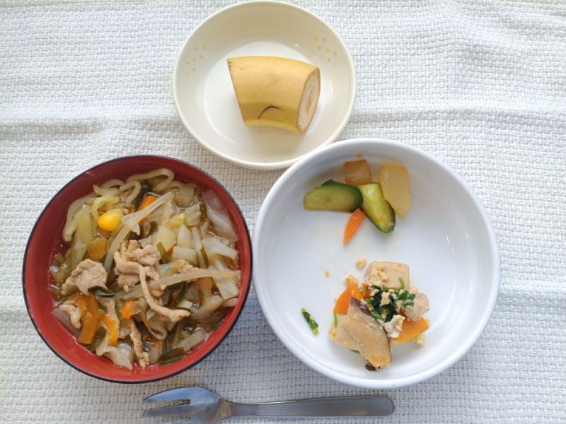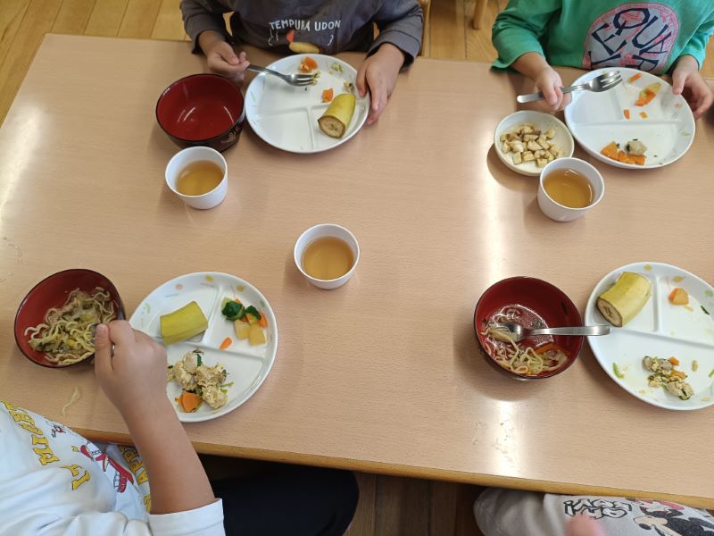給食では中華麺を茹でるのではなく、蒸して使います。