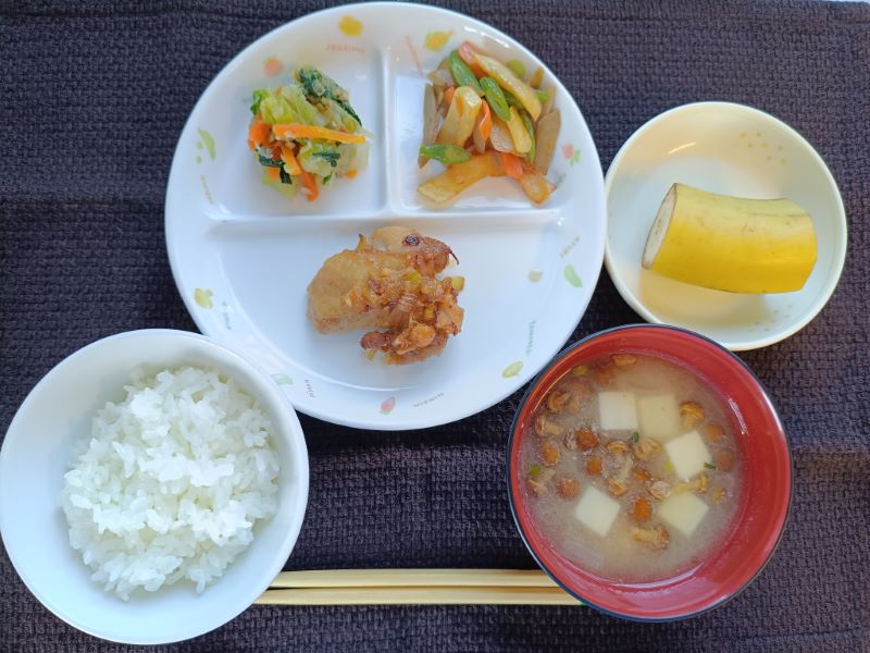 和食メニューです 2026年2月19日 木曜日給食ブログ 今日は鶏肉の香味焼きの和食メニューです。 にんにく、しょうがをすりおろし、きざんだ長ねぎ、すりごま、三温糖 しょうゆ、こしょう、ごま油に漬け込んでオーブンで焼きました。 つき組さんが4月に作ったみそが完成しました。 今日の給食(幼児量) ★ ごはん ★ ★ 鶏肉の香味焼き ★ ★ じゃが芋のきんぴら ★ ★ 小松菜とキャベツのおろしあえ ★ ★ なめこの味噌汁(小ネギ) ★ ★ バナナ ★ 今日のおやつ ★ じゃりパン ★ ★ 牛乳(幼・乳) ★