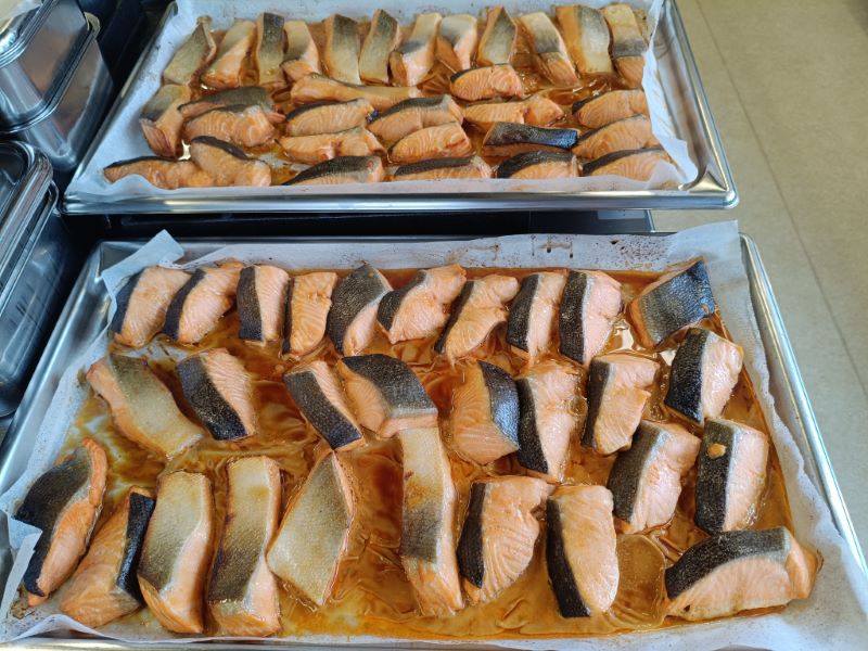 鮭はしょうゆ、酒、みりんで漬け込んで照り焼きにしました🐟
