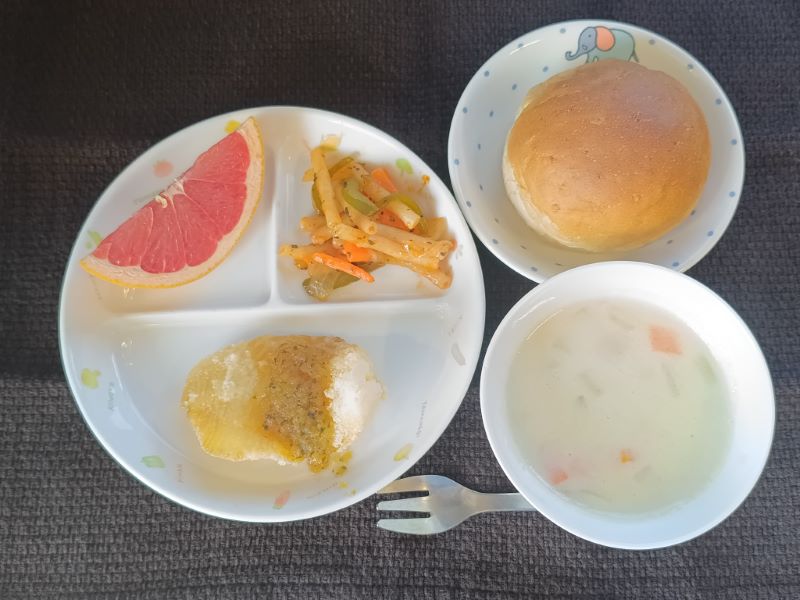 洋食メニュー✨ 2025年12月16日 火曜日給食ブログ 今日の給食は洋食メニューです✨ パン、カレイの変わりソース、マカロニソテー、豆乳シチューはどれも人気のメニューで、 おかわりが沢山ありましたが、食缶はピカピカでした!!👏 今日の給食 ★ 胚芽パン ★ ★ カレイの変わりソース ★ ★ マカロニソテー(バジル) ★ ★ 豆乳スープ ★ ★ グレープフルーツ ★ 今日のおやつ ★ カルシウムごはん ★ ★ 牛乳(幼・乳) ★