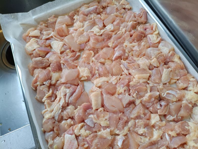 細切れの鶏もも肉にすりおろしたしょうが、にんにく、塩、酒で下味をつけてオーブンで焼きます。