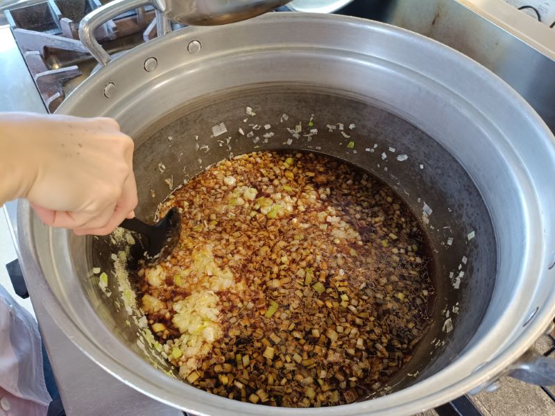 火が通ったら、しょうゆ、米酢、三温糖、すりごま、ごま油で味を調えタレのできあがりです。