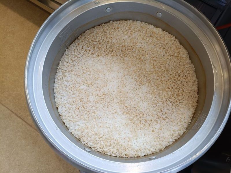 鶏肉が焼きあがったら、鶏肉から出た汁を炊飯器に入れ米と押し麦と一緒に炊きます。