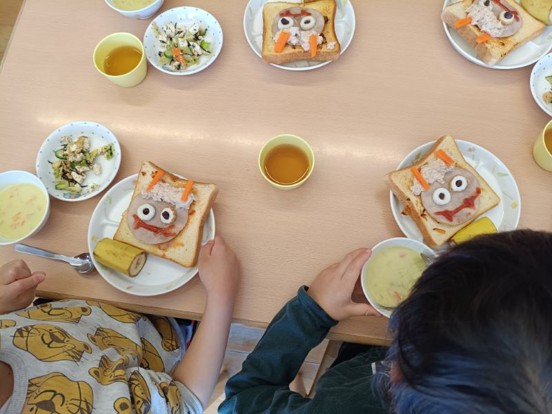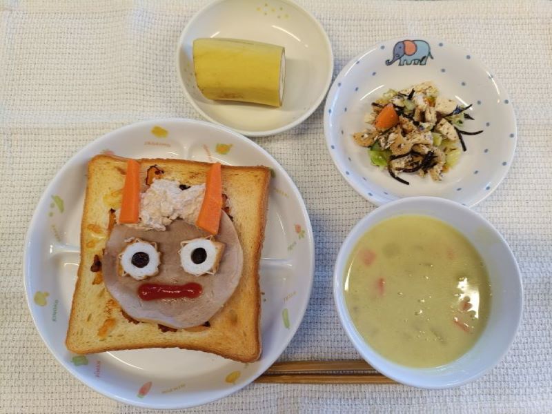 にんじんのつのをかざりかわいい鬼の顔を作りました。