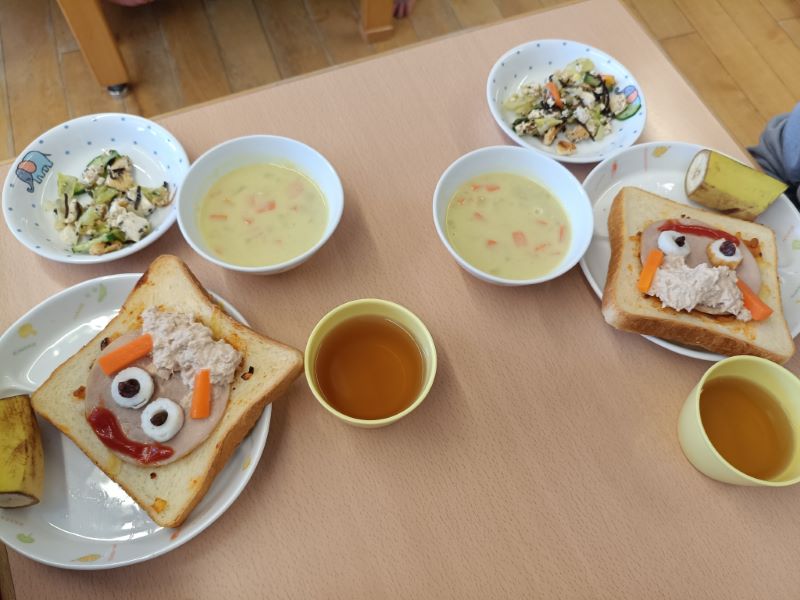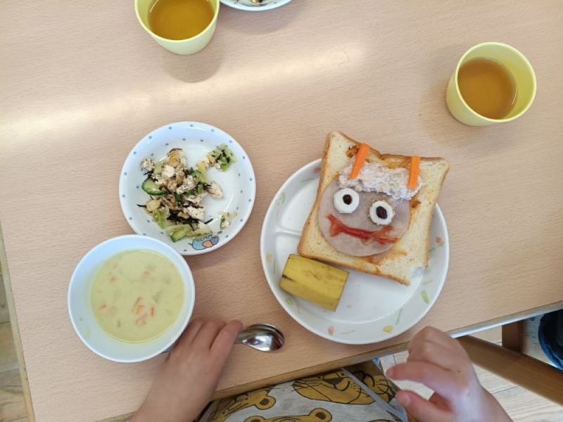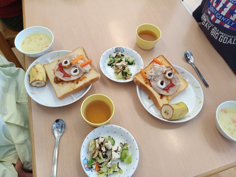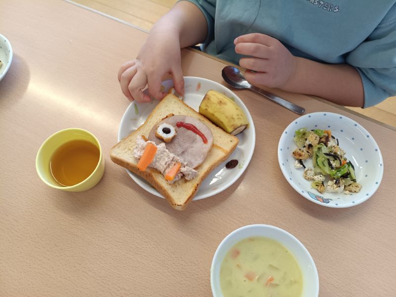 ピザトーストの上に、ハムで輪郭、ツナマヨで髪の毛、ちくわ、レーズンで目を作り、