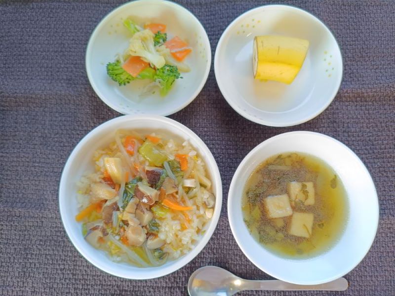 野菜たっぷり、あんかけチャーハン 2025年11月26日 水曜日給食ブログ 今日はあんかけチャーハンです。 ごはんと一緒に醤油を炊き込み香りを付けます。 そして炒り卵も合わせたごはんに野菜たっぷりのとろとろのあんをかけて食べます。 今日の給食(乳児量) ★ あんかけチャーハン ★ ★ 花野菜とじゃこのサラダ(中華) ★ ★ もずくスープ ★ ★ バナナ ★ 今日のおやつ ★ ミニたい焼き ★ ★ 牛乳(幼・乳) ★