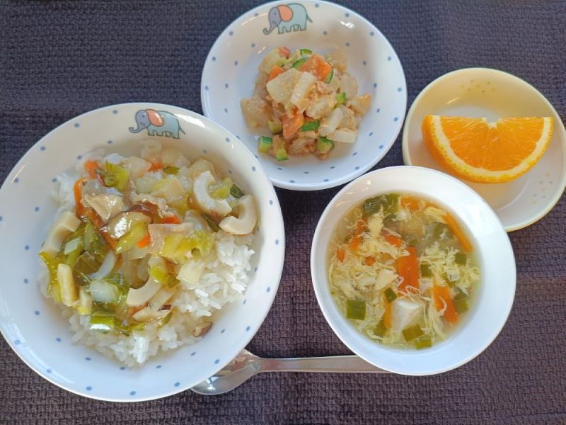 野菜たっぷり中華丼✨ 2026年1月19日 月曜日給食ブログ 今日の給食は中華丼です💡 保育園の中華丼には人参、白菜、小松菜、しいたけ、たけのこ等のたくさんの野菜と、 豚肉、ちくわが入っています✨ この他に、なるとやうずらの卵などが入ると更においしくなりますよ⭐ 今日の給食 ★ 中華丼 ★ ★ 大根サラダ(ツナ) ★ ★ にらたまスープ(豆腐入り) ★ ★ オレンジ ★ 今日のおやつ ★ お好みマカロニ ★ ★ 牛乳(幼・乳) ★