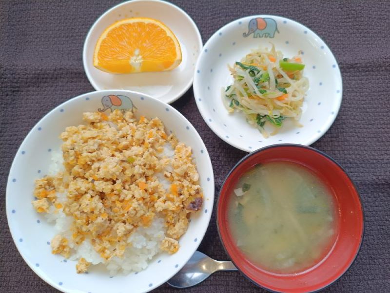高野豆腐のそぼろごはん 2025年12月3日 水曜日給食ブログ 今日は高野豆腐のそぼろごはんです。 高野豆腐を戻してフードプロセッサーにかけます。 にんじん、長ねぎ、たけのこもフードプロセッサーにかけ 鶏ひき肉を炒め野菜も加えてだし汁を加えて煮ます。 食べやすくて人気のメニューです。 今日の給食(幼児量) ★ 高野豆腐のそぼろごはん ★ ★ ごま味噌和え ★ ★ 豚肉とごぼうの味噌汁 ★ ★ オレンジ ★ 今日のおやつ ★ クロワッサン ★ ★ 牛乳(幼・乳) ★