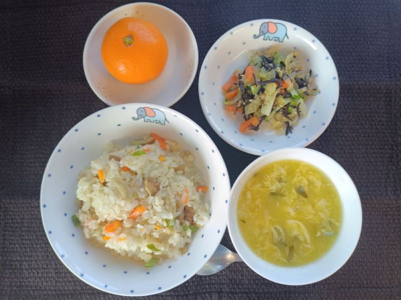 鶏ごぼうピラフ🐔 2025年12月17日 水曜日給食ブログ 今日の給食は鶏ごぼうピラフです。 バターで具を炒めてご飯と混ぜるので、バターの香りがとてもいい香り✨ ごぼうとの相性もとっても良いピラフです✨ サラダのドレッシングはゆずの皮をすりおろして、果汁も使っています💡 今日の給食 ★ 鶏ごぼうピラフ ★ ★ ゆずごまサラダ ★ ★ 中華風コーンスープ(卵) ★ ★ みかん ★ 今日のおやつ ★ ミニたい焼き ★ ★ 牛乳(幼・乳) ★