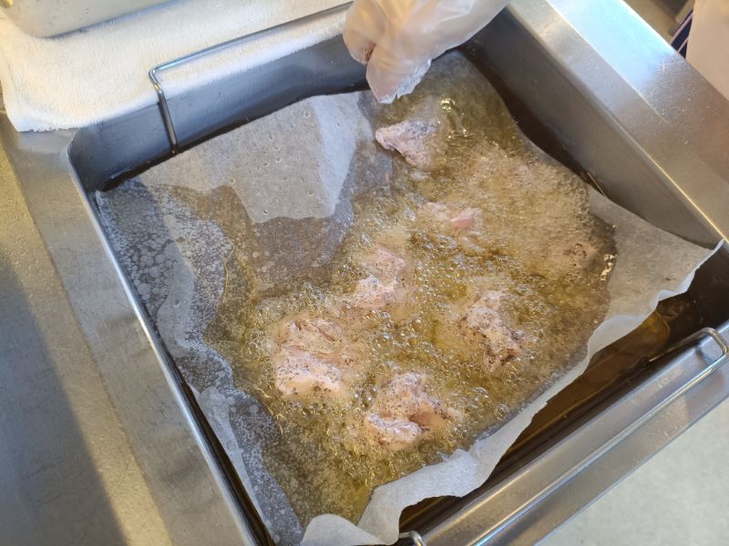鶏肉のゆかり揚げは、小麦粉を水で溶いたものにゆかりを混ぜ、てんぷらの様に衣をつけて揚げます🔥