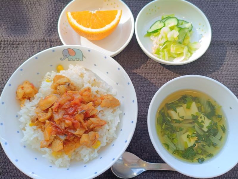 鶏肉のトマト煮🍅 2026年1月24日 土曜日給食ブログ 今日の給食は鶏肉のトマト煮ライスです💡 トマト煮をおいしく完成させるコツは、具材をよく炒めて、ひたすら煮込むこと!!です🍅 今日は給食を提供するギリギリまで、コトコト弱火で煮込んでいました。 お肉もとっても柔らかくなって食べやすくなりますよ💛 今日の給食 ★ 鶏肉のトマト煮ライス ★ ★ フレンチサラダ ★ ★ ほうれん草と豆腐のスープ ★ ★ オレンジ ★ 今日のおやつ ★ クロワッサン ★ ★ 牛乳(幼・乳) ★