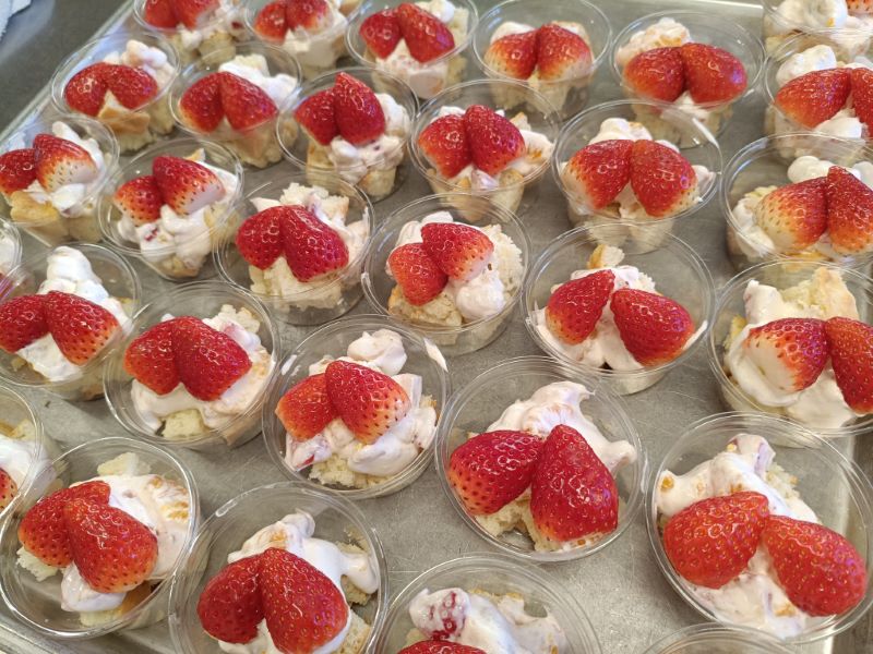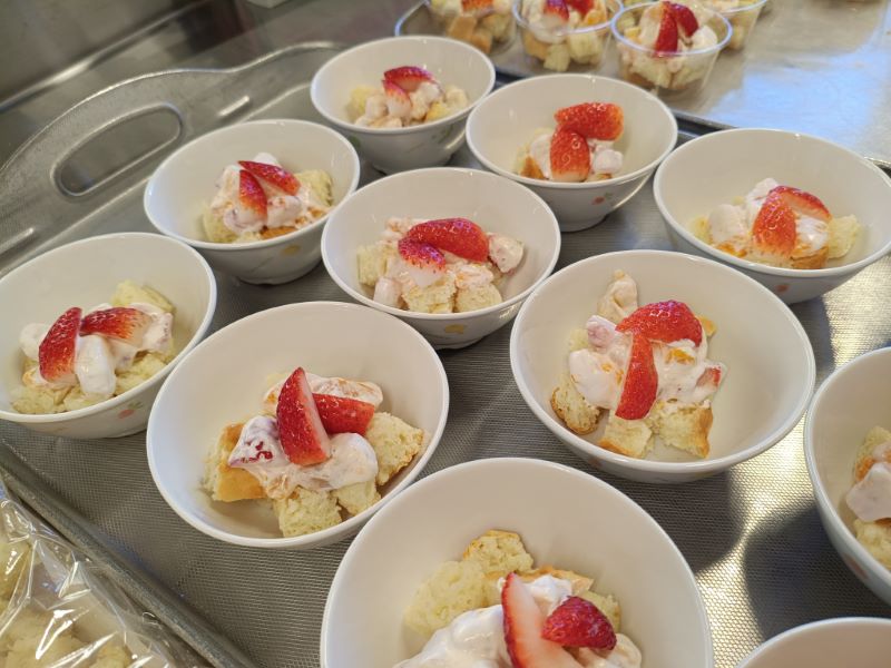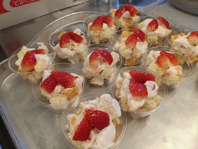 カップにコロコロ生地とフルーツ生クリームを入れてイチゴを飾ったら出来上がりです✨