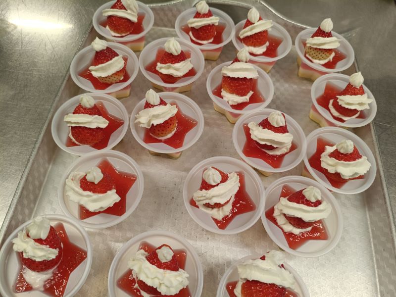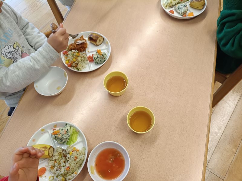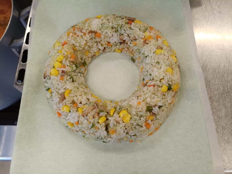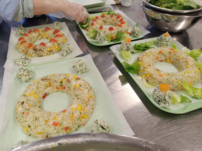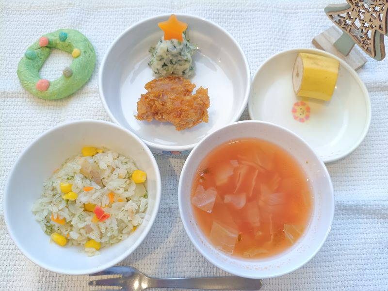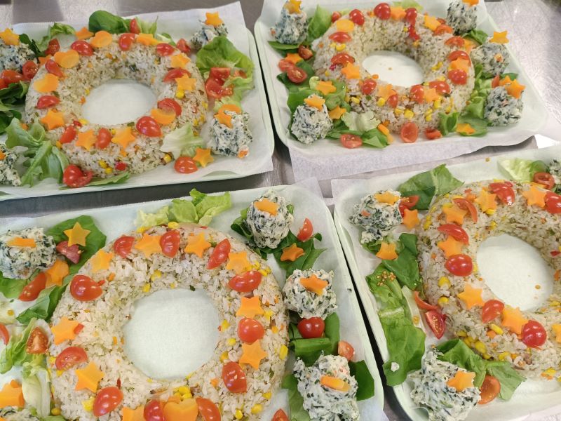 お昼ごはんは、リースの形のピラフ、ツリーに見立てたポテサラツリーや